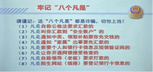 讲座现场还通过PPT展示了“八个凡是”反诈识别口诀,帮助同学们快速识别常见诈骗话术。