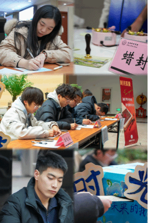 活动现场,志愿者们热情引导、细致协助,为活动添上了一抹温情底色。师生们或独坐斟酌,或与好友相伴落笔,学院专属的信笺与蜡封印章,为这份心愿添了独有的仪式感。温热蜡液滴落、压印出清晰纹样,一份份郑重的期许被封存进信封,投入“时光信箱”,完成一场跨越四季的自我对话。