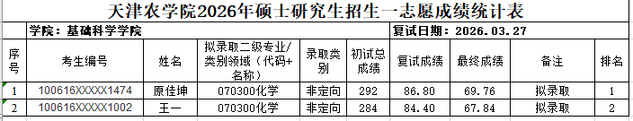 天津农学院基础科学学院2026年研究生招生复试一志愿成绩公示